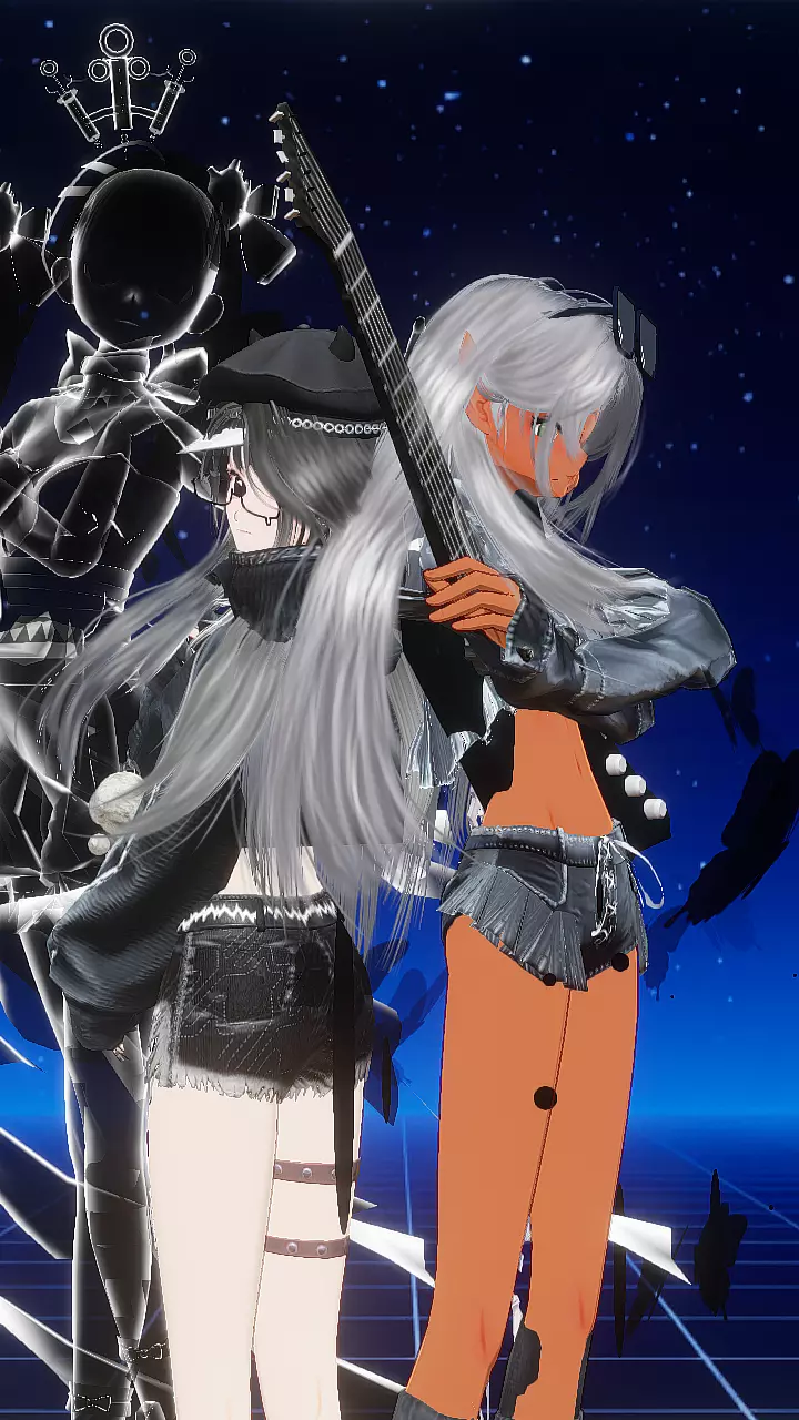 融合朋克摇滚风格,兼具叛逆感与虚拟形象的个性表达,属于亚文化混搭的虚拟穿搭风格。