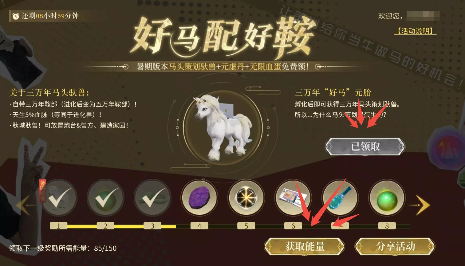 3.今日活跃度达成120+分享活动后,即可直接领取