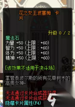 2、花之女王波塞姆卡片(力量增加50,智力增加50,体力增加50,精神增加50),可连续升两级;