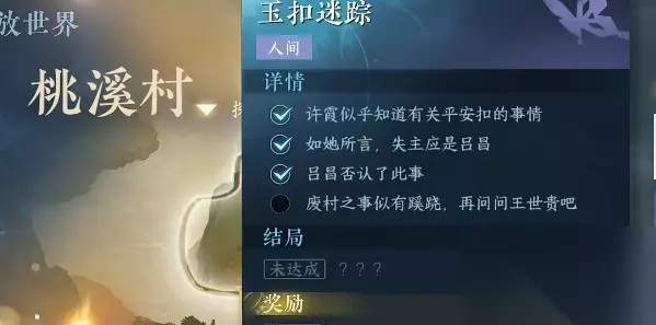 逆水寒手游玉扣迷踪任务攻略 位置:桃溪村(866,1274) NPC:许霞 任务步骤 1、首先我们来到桃溪村上述的位置之后我们和NPC李霞来进行对话,对话我们需要进行两次然后就可以解锁我明白了这样我们就可以获得任务的线索; 2、根据任务的线索我们需要找到吕昌,我们向他出示平安扣,然后进行对话获取线索; 3、根据线索我们需要找到王世贵继续询问,对话结束之后我们找到河边的候飞进行对话;