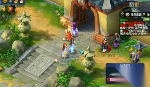 3、战斗怪比较简单,自己分配好角色就可以进行刷怪了。 4、直至捡到20多朵花后就站在玄奘前面看怪物就丢花,保护完玄奘后随便点太保或者婆婆进入战斗。 5、战斗结束后进入观音寺,找到黑熊击杀,击杀后会有奖品。 6、观音寺里有5处火,随机位置,在天宫地图里出现8个天降,完成8个后回观音寺会都会变为小火。 7、跟着任务走传送到黑风山,进入战斗,杀完黑熊精后按着小妖的路线走,最后杀进去黑风洞。