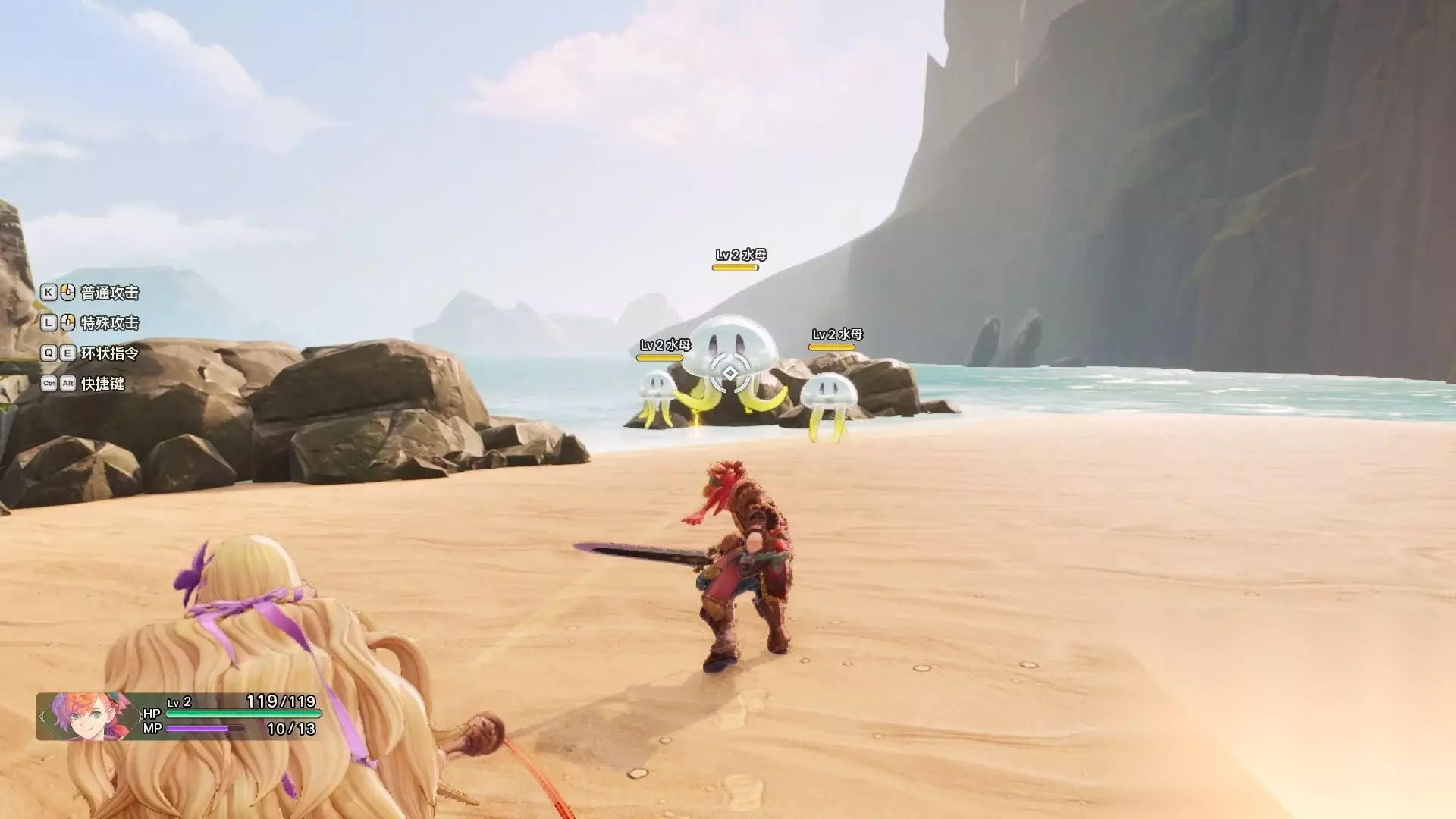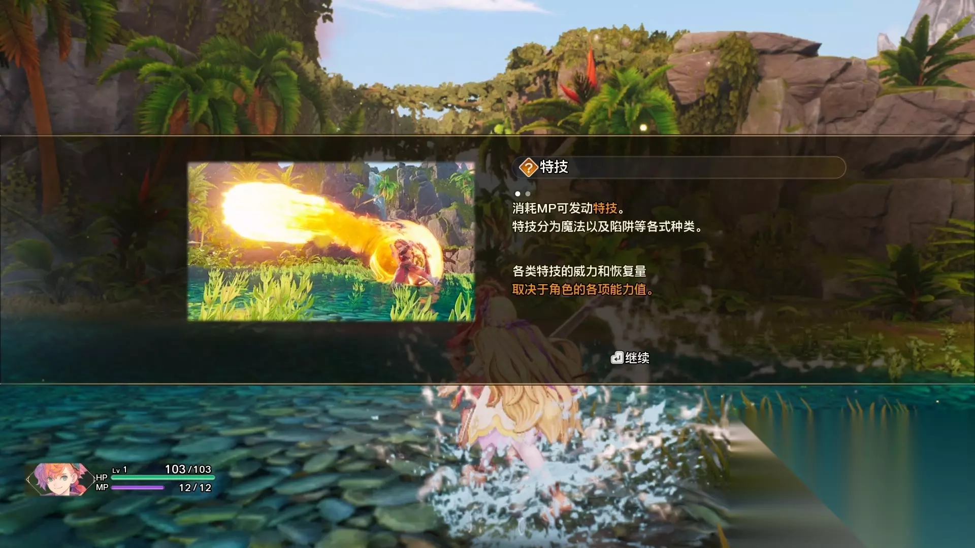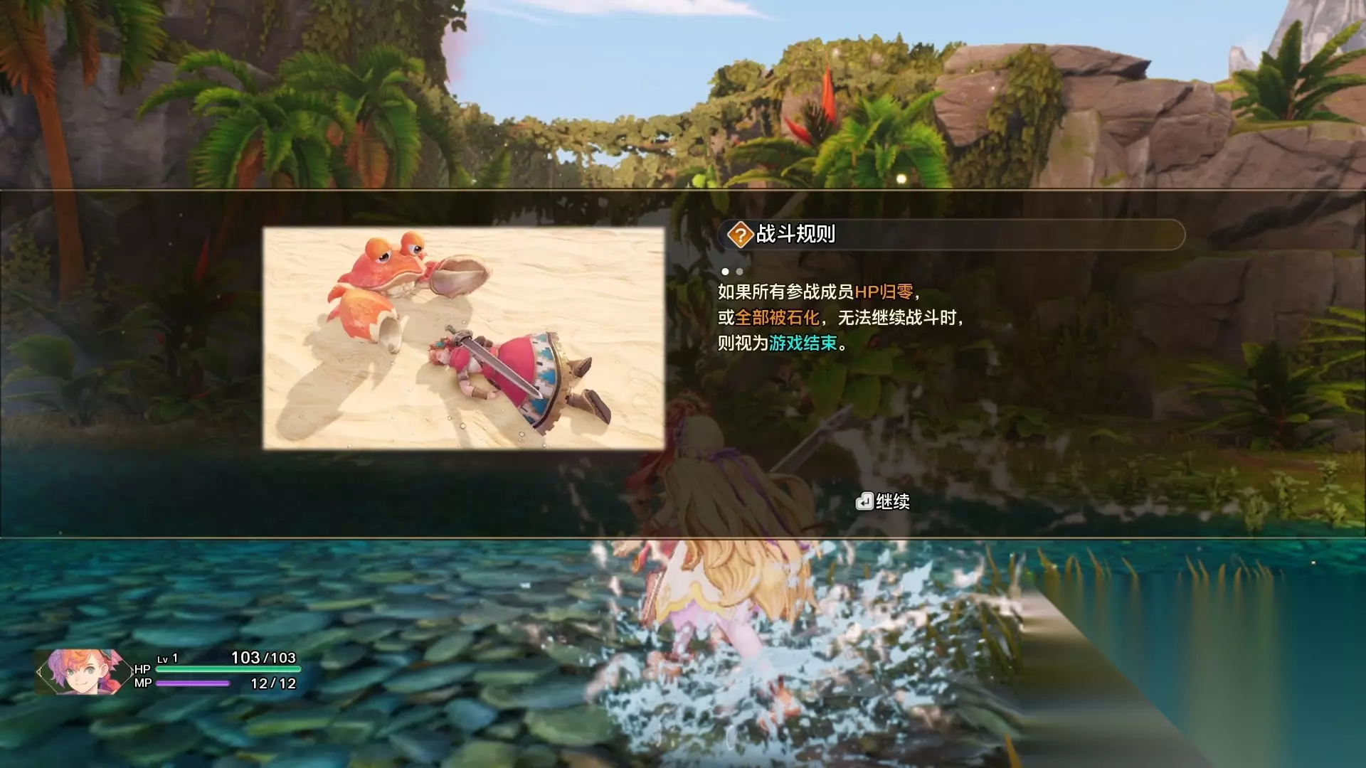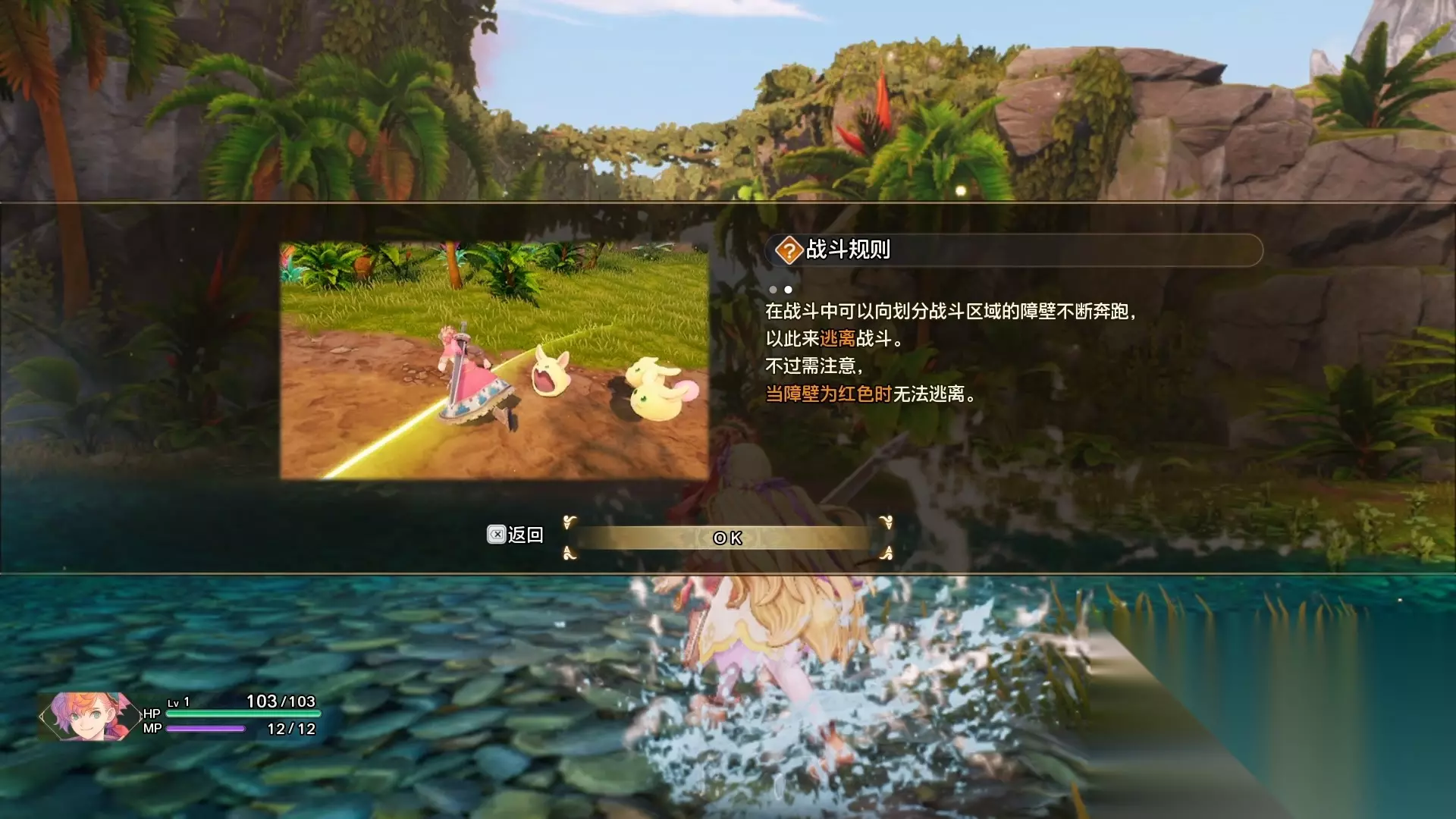随着剧情走到前面的目的地,会给玩家介绍一些基础的战斗规则。战斗的时候如果想逃跑,可以一直往战斗区域的障壁不断奔跑来逃避战斗,不过障壁是红色的无法逃离。