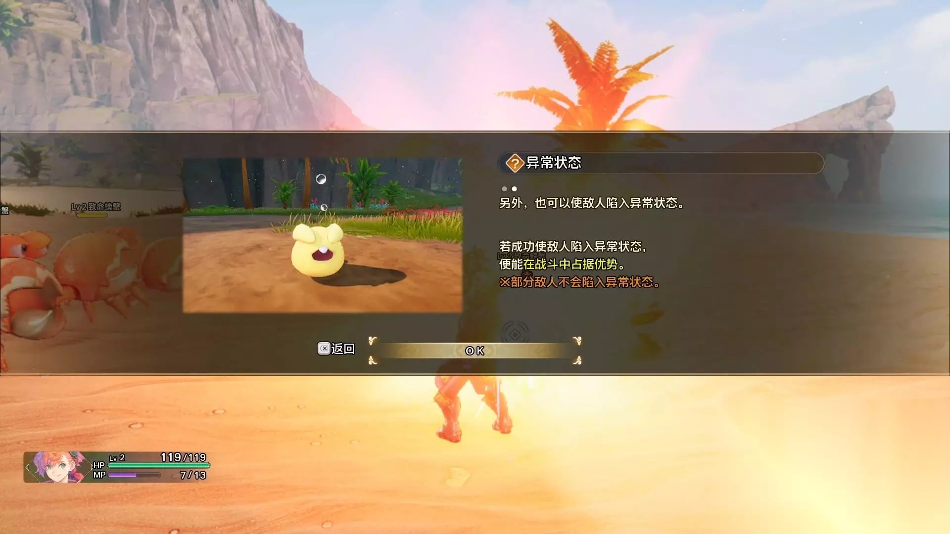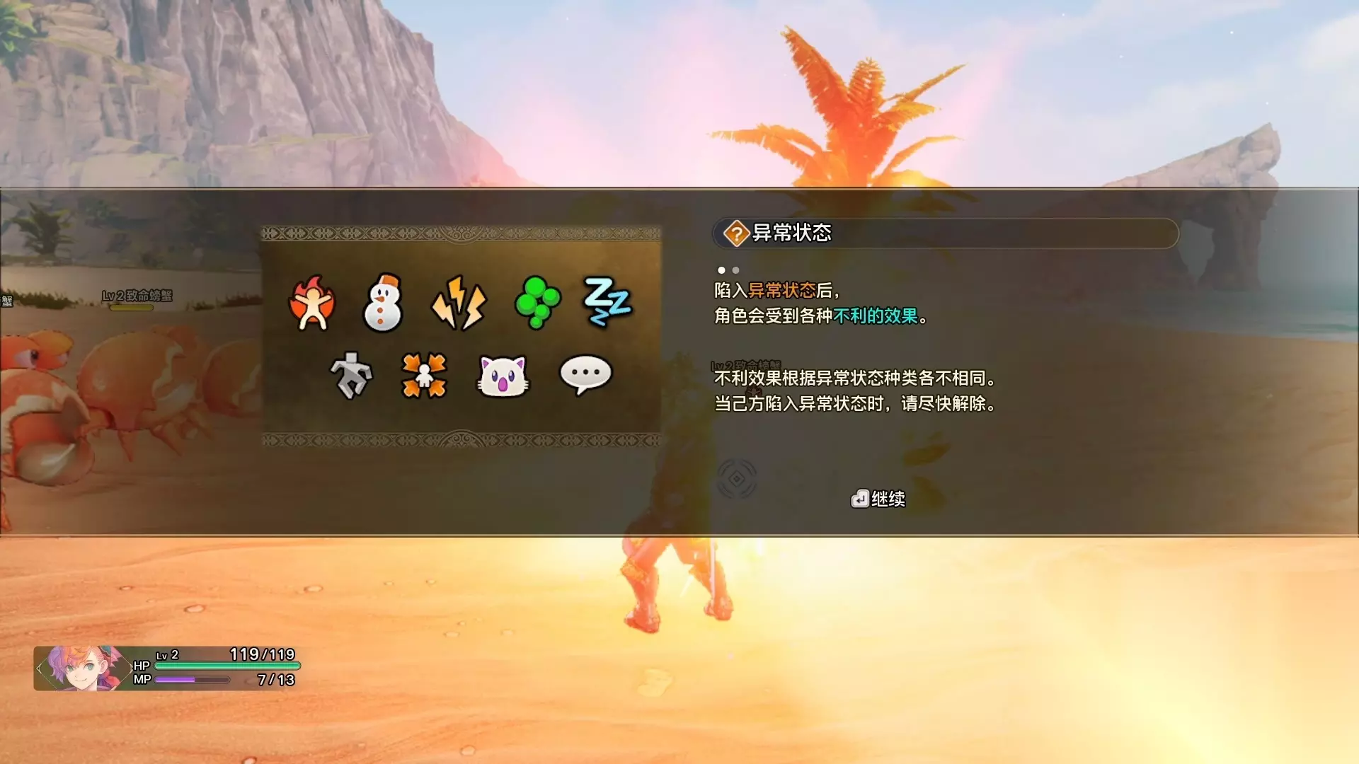 在被带有异常的魔物攻击之后,系统也会弹出有关异常的介绍,比如被异常和给敌人挂异常。只需要了解一下这个概念就好。