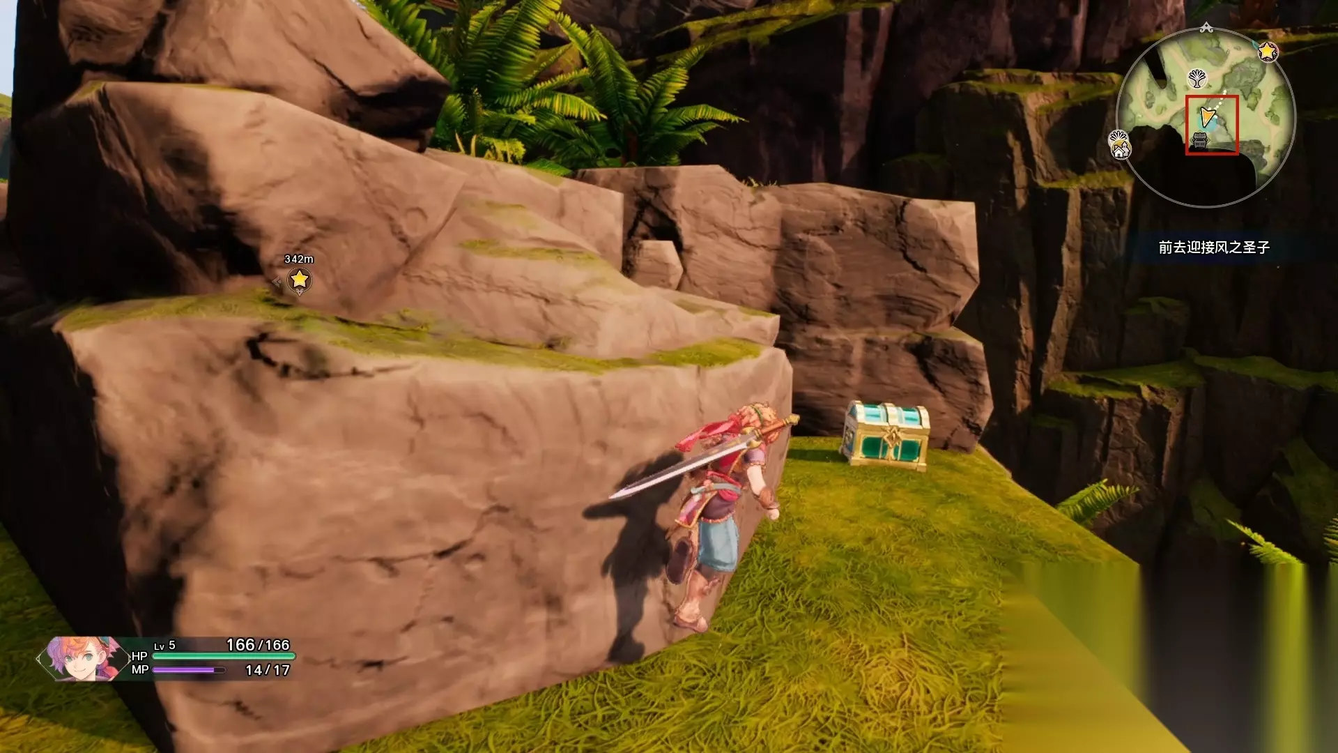 这个地图角落有一个宝箱(红圈)是在山上的,我们可以从后面的山体爬上去,这边上不去。