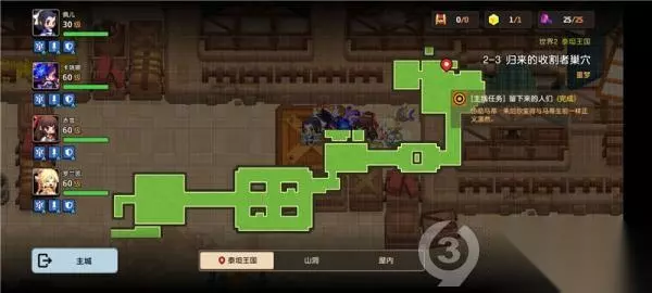 坎公骑冠剑噩梦2-3全收集图文通关攻略,游戏有着精制的人物立绘以及超多好玩的剧情故事,玩家可以结识各种英雄伙伴,共同踏上一起冒险的旅程,下面一起来看一下坎公骑冠剑噩梦2-3归来的收割者巢穴三星完美攻略. 2-3地图(需要一个任意用拳套的英雄带队)
