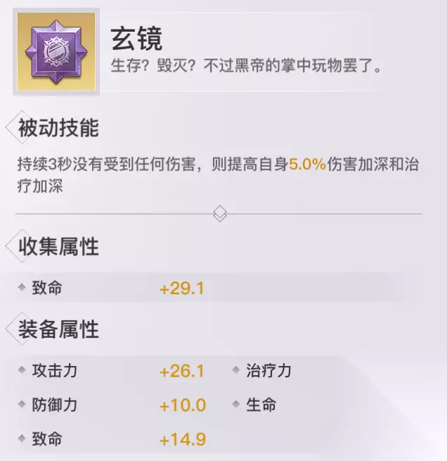 获取方式:魂域之战、摆摊、神格助力袋 评价分析:半血回血,自我治疗,提高装备者存活率,PVP和PVE皆可用。 玄镜: 收集属性:致命 获取方式:生死场、摆摊、神格助力袋 评价分析:3秒不打,再扔技能伤害加强,适合收集不适合装备。
