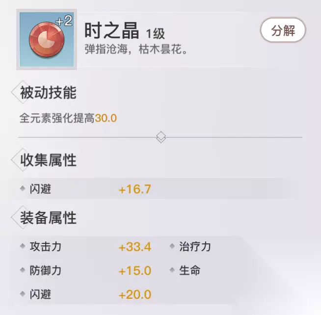 时之晶: 收集属性:闪避 获取方式:青麟镇妖、怒鳞商店、神格助力袋 评价分析:提高装备者PVP玩法中元素技能的伤害。