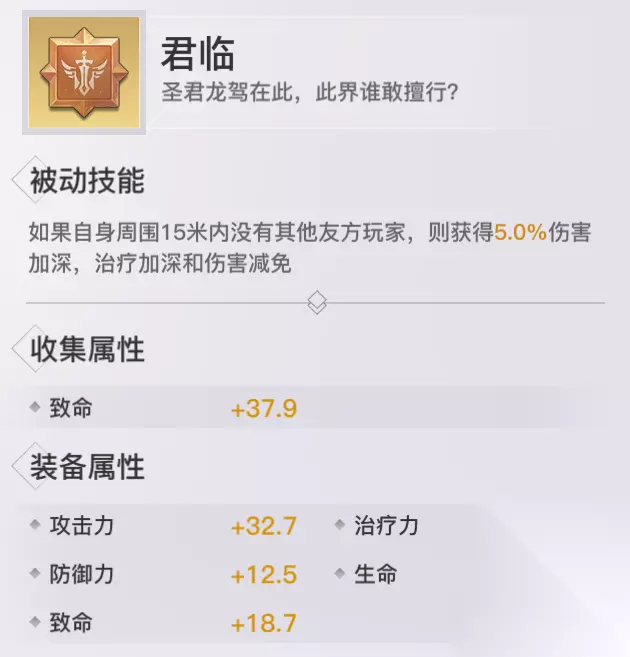 君临: 收集属性:致命 获取方式:公会拍卖、领地战拍卖、摆摊、神格助力袋 评价分析:单人战斗时,攻击力,治疗能力,减伤能力都会提高,单挑玩法的神器。