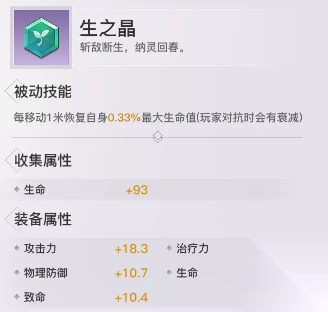 生之晶: 收集属性:生命 获取方式:公会活动拍卖、摆摊、神格助力袋、每日礼包 评价分析:生之晶是一个非常神品的PVP回血神器,尤其是在单挑玩法中。通过移动就能回血,让装备者不用再担心自己残血必死的问题,拉远距离跑就完事了。