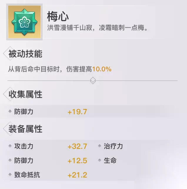 梅心: 收集属性:防御力 获取方式:商城(圣物之大宝图)、摆摊 评价分析:PVE非扛伤害输出职业神器,副本输出效率大大提高。