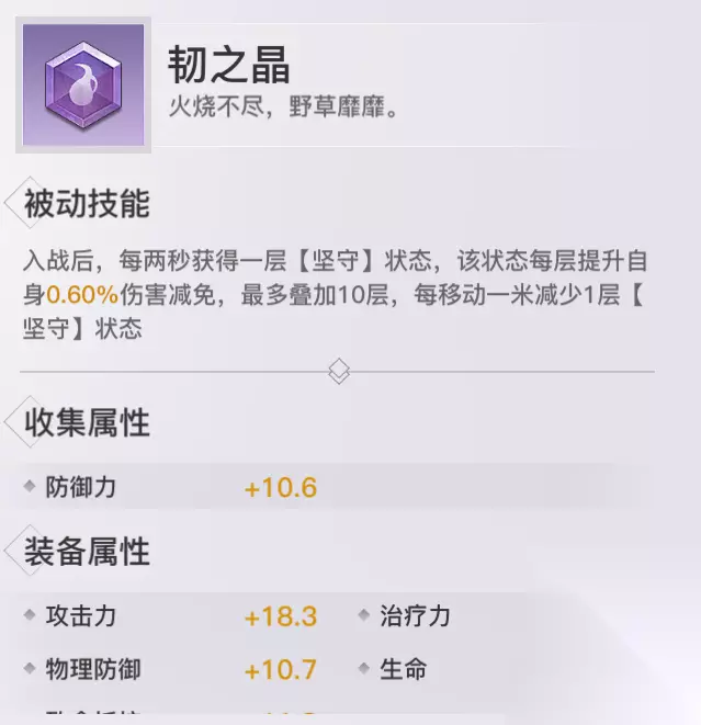 韧之晶: 收集属性:防御 获取方式:怒鳞商店、暗影心魔、青麟镇妖、摆摊、神格助力袋、每日礼包 评价分析:佩戴上韧之晶后,最大化神格效果的方式就是原地不动,能达成或者比较能达成这个条件的环境,基本上就是PVE中原地打怪或者原地拉BOSS的情况,PVP中用处不大。