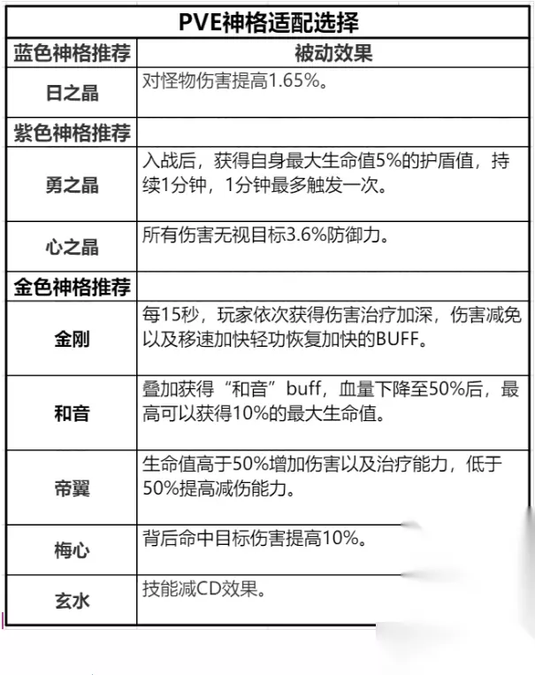 PVE神格解析: 1、蓝色神格中只有一个日之晶是完全PVE的选择,前期没有其他品质的神格时,可以先拿着用。 2、紫色神格中勇之晶偏向防御类,心之晶偏向攻击类,不过,由于心之晶容易获取(绑玉购买),所以优先推荐心之晶以及日之晶的组合。 3、金色神格中,玄水,金刚全体适用,副本中的非拉怪职业优先考虑梅心,拉怪职业可以佩戴和音,输出以及治疗职业可以先考虑帝翼。 PVP神格选择: 在PVP中,由于不同职业的属性以及战斗方式等不同,我们在神格的选择方面也会有所不同,而且,即使是像在神耀竞技这种平衡玩家属性的玩法中,神格也是会发挥作用的。