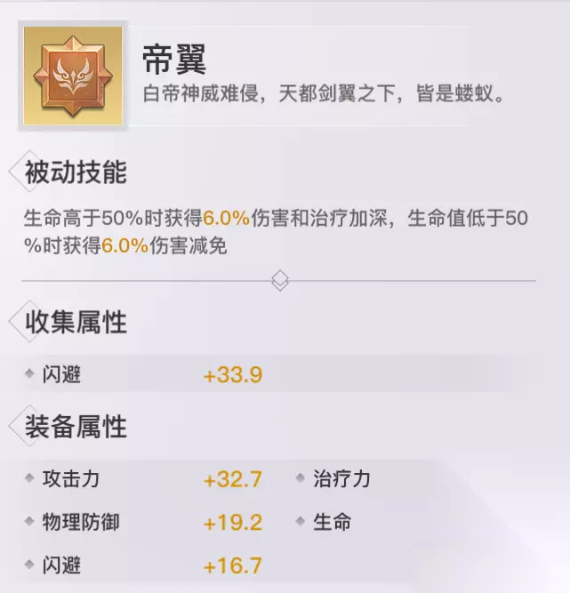 帝翼: 收集属性:闪避 获取方式:商城(圣物之大宝图)、摆摊 评价分析:生命越高伤害和治疗能力越强,生命低则加强装备者防御能力,PVE和PVP通用神格。