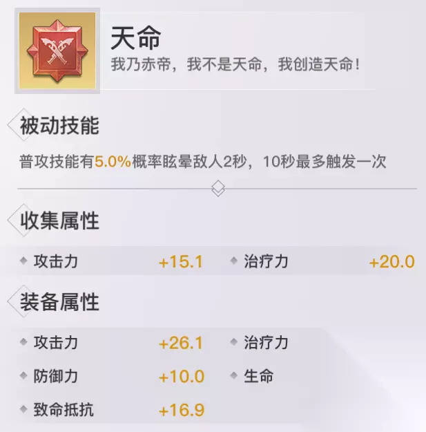 天命: 收集属性:攻击&治疗 获取方式:决战云巅、摆摊、神格助力袋 评价分析:PVP中可加强对敌人的控制。