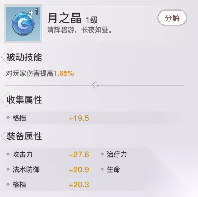 月之晶: 收集属性:格挡 获取方式:青麟镇妖、怒鳞商店、神格助力袋 评价分析:纯PVP向的蓝品神格,用于加强攻击伤害。