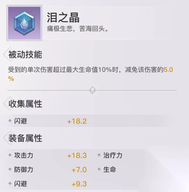 泪之晶: 收集属性:闪避 获取方式:摆摊、商城(圣物之大宝图)、每日礼包 评价分析:针对于PVP中受到暴击伤害时,可以减少暴击伤害带来的血量上的损失,防御类的神格不过效果一般。