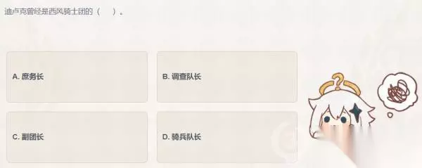 原神派蒙的十万个为什么答案是什么 派蒙的十万个为什么答案大全 派蒙的十万个为什么答题 迪卢克曾经是西风骑士团的()。 A.庶务长 B.调查队长 C.副团长 D.骑兵队长 正确答案:骑兵队长