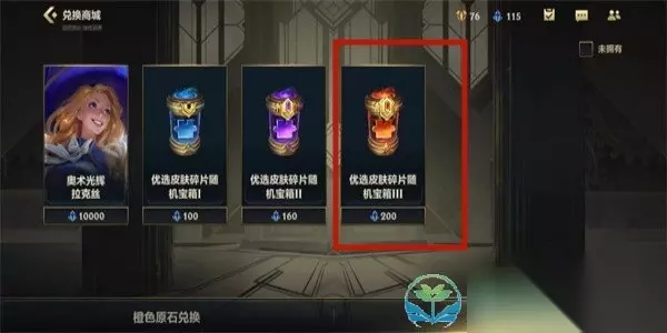 5、最后选择【优选皮肤碎片随机宝箱III】,需要200银色星尘就能兑换了,直接打开就可以获得一款随机的传说品质的皮肤碎片了。