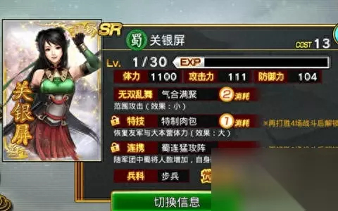 关银屏作为关羽之女,也是四个起始武将中唯一一位女性,作为女性武将的她拥有第二起始高的攻击力,防御力则稍微逊色。相对来说关银屏的无双乱舞和特技特技消耗就低了不少,不过特技是属于恢复性特技,更多时候也能够增加防御性效果。 值得关注的是,关银屏的连携是属于猛攻连携,这也就给战斗中的她带来了不小强袭的能力,虽然攻击力度没张辽强悍,但是能力相对比较平均的她所具备的更多是可攻可守的能力,同时对于她来说也是各位新手第一次接触游戏时可以选择的。