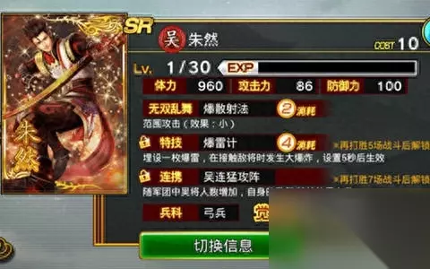 朱然作为弓兵来说其数值几乎是所有起始武将之中最低的,但是朱然拥有的是最高的移动速度、攻击速度和攻击距离。相对来说朱然比较大问题在于特技消耗异常高(所有人物中最高的),并且只是一个定时炸弹作用,往往效果可能还没发挥敌人就已经死了或者炸弹炸了但没炸到人。 似乎作为补偿的是,朱然的连携是猛攻阵类型,这点补偿了他攻击力偏低的情况。相对于其他武将而言朱然所需要的技术要求比较高,建议接触了一定阶段的玩家再来使用朱然进入游戏。