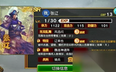 张辽相对来说动作会比其他三个武将缓慢,不过攻击力来说相对较高,很快就能够解决敌将,无双乱舞和特技消耗上相对偏高,也就限制了这个职业在具体战斗中的表现情况(即便你平时战斗力高,必要的时候还是要靠特技和无双乱舞来解场) 值得留意的是,张辽的特技是不仅仅能够破坏战斗中的阻碍物,并且能够加强自己的攻击力(虽然cd时间并不短),这也就给张辽带来了一种气势汹汹的进攻气势,同时因为连携是神速,也就让张辽在恢复特技和乱舞上具备更强能力,不得不说是以一种狂战士风格的形式出现。 唯一缺点也是刚才所说的慢,容易被人放风筝形式解决,同时一旦敌人多为弓兵容易还没来得及解场就被敌人用弓兵攻占阵地了,如果不知道选择哪一个武将,张辽是第一个可以选择的。