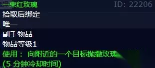 3、一束红玫瑰 装备类型:副手物品 物品等级:1 使用效果:向附近的一个目标抛撒玫瑰的花瓣! 装备出处:掉落(50%掉落率)