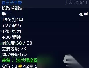 6、血王子手套 装备类型:布甲 增加159点护甲 增加27耐力 增加45智力 增加38精神 耐久度:30 需要等级:73 物品等级:167 装备效果:法术强度提高39点。 装备出处:安卡赫特古代王国副本塔达拉姆王子(33.3%掉落率)。