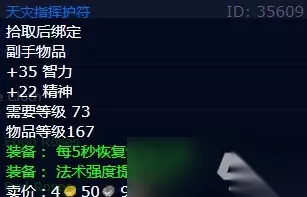 5、天灾指挥护符 装备类型:副手 增加35智力 增加22精神 需要等级:73 物品等级:167 装备效果:每5秒恢复9点法力值。 装备效果:法术强度提高29点。 装备出处:安卡赫特古代王国副本塔达拉姆王子(33.3%掉落率)。