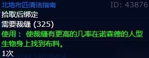 7、北地布匹清洁指南 装备类型:裁缝图样 物品等级:70 需要裁缝:325 使用:使裁缝有更高的几率在诺森德的人型生物身上找到布料。 装备出处:掉落(8.5%掉落率)