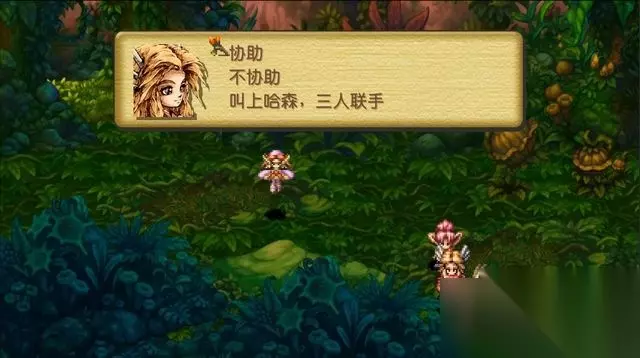 对话完出来往下走,被传送回入口。 继续进入森林,追踪之前的两名NPC,与之交谈,选择“协助”。 对话完后,NPC会跑走,跟随之。