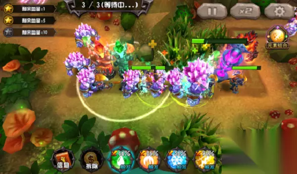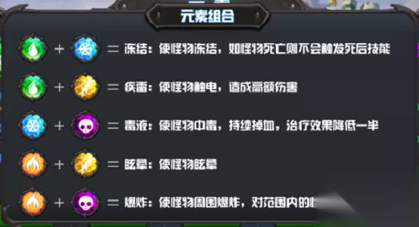 虽然玩家在《元素塔防》中的自主性比较高,能够自由搭配元素,但并不是所有元素组合都能产生效果。一般说来,元素组合有以下五种方式:
