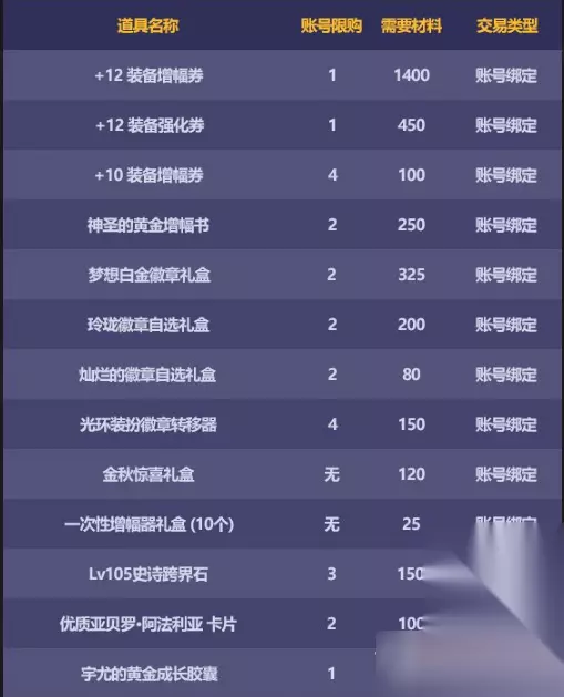 兑换道具如下: