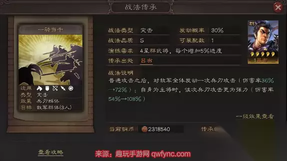 三国志战略版游戏当中的一骑当千是一个S级别的战法,玩家们只能通过传承获得,这个战法可以对敌方的所有武将造成不小的伤害,实力还是不容忽视的,但是如果放错了位置也是…