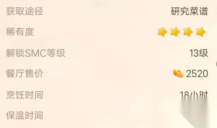 获取途径:研究菜谱 解锁等级:13级 餐厅售价:2520摩尔豆 烹饪时间:18小时 保温时间:90小时