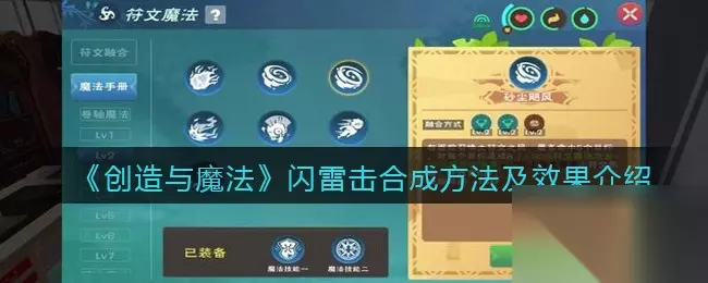 闪雷击 合成方式---雷+雷+雷 技能说明:对前方最多两个目标释放符文闪电,每道闪电造成18(+80%符文魔法攻击+80%雷符文强度)符文伤害,对潮湿的目标造成额外伤害(伤害值基于符文魔法攻击),冷却时间13秒. 释放方式:点按瞬发 评价:基础闪电术,至多攻击两个目标,伤害中规中矩,只受单属性加成,可以用于补位。可以用于连锁潮湿debuff造成额外伤害。 以上就是本期的全部内容了, 希望内容可以帮助到有需要的玩家,本站还有其他热门游戏攻略,感兴趣的小伙伴们快过来一起看看吧! 以上就是小编为大家带来的'创造与魔法'相关攻略啦,希望能够给大家带来帮助! 更多好玩精彩的攻略欢迎关注233乐园