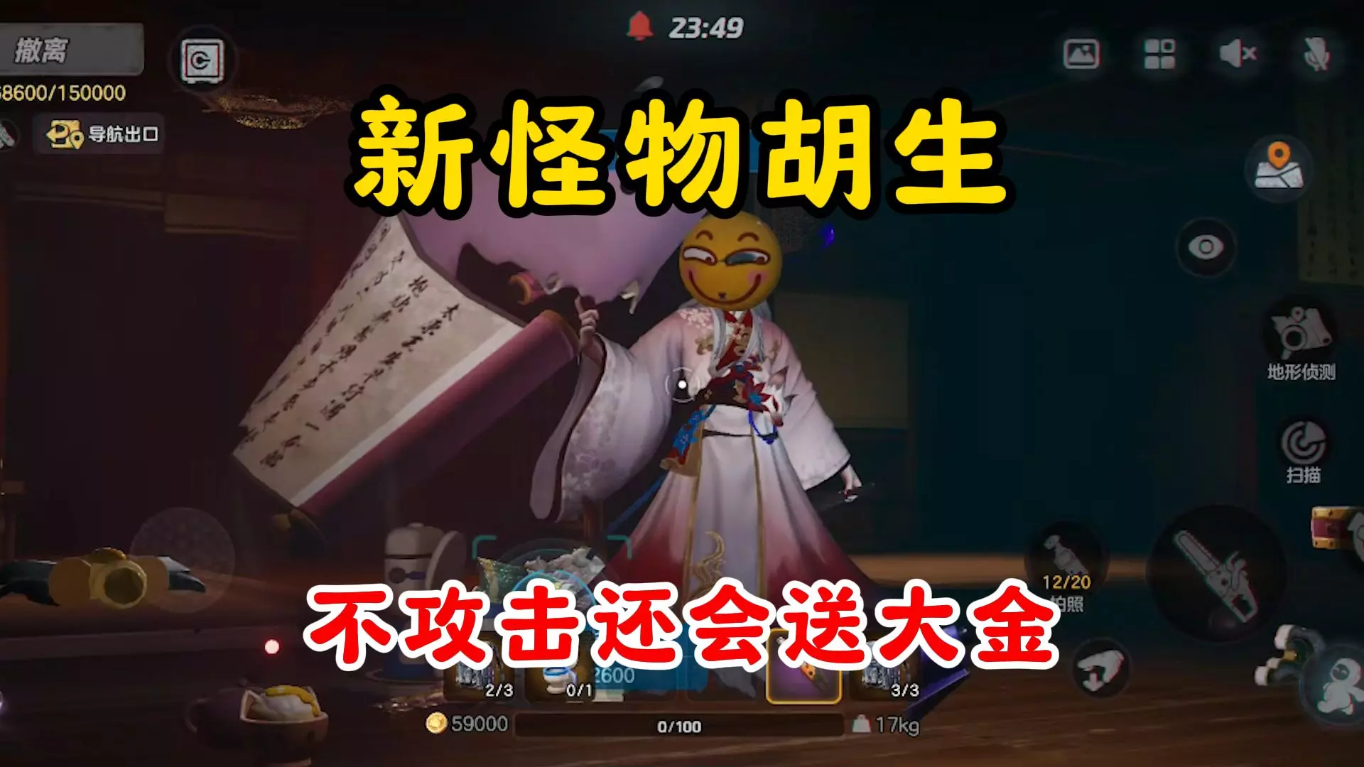 这是《探灵实录》的游戏技巧分享,教玩家找胡生速刷狐说八道藏品,当前可利用未修复的bug来刷,还展示了游戏内商店道具、对局内的相关道具和操作画面。
