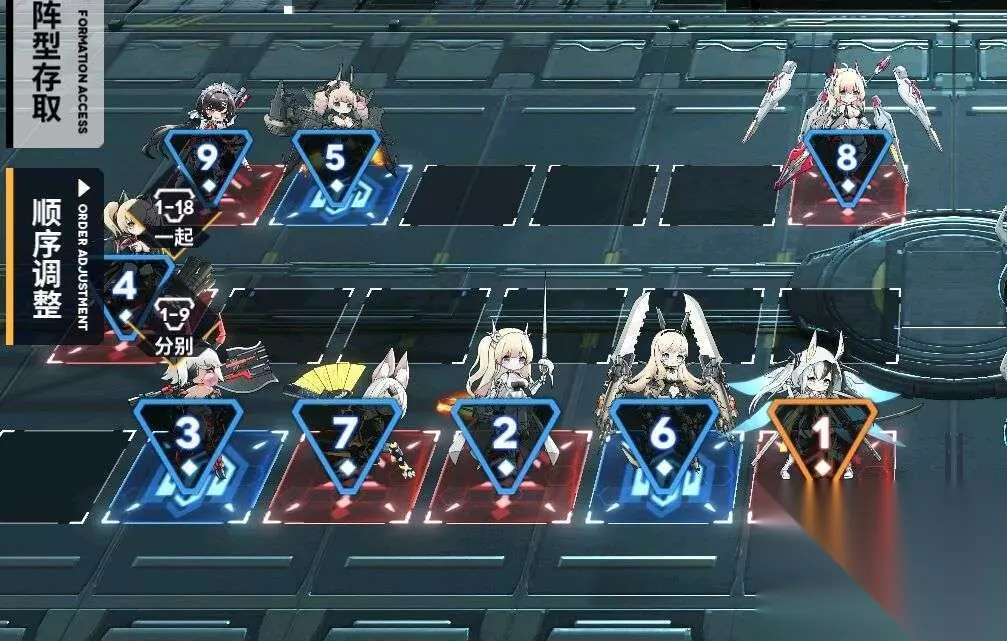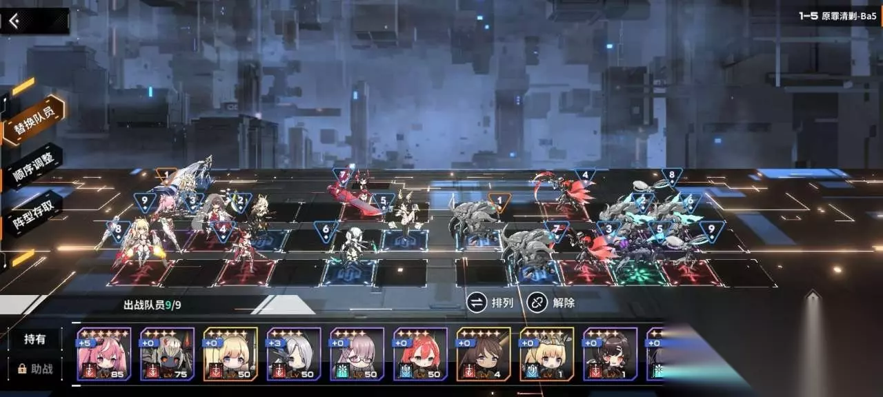 因此,战斗前的排阵阶段是整场战斗中玩家唯一能够进行操作的部分。 一般来说,玩家需要将我方9名角色放置在3×7的格子中,并给每位角色安排行动顺序,使我方输出角色尽可能的优先攻击敌方的高威胁角色,并让我方坦克尽可能的抗下敌方角色的伤害,从而实现战斗胜利。 因为每一关敌人的配置与行动顺序都不一样,我方的排阵也就需要根据敌方的配置而调整。