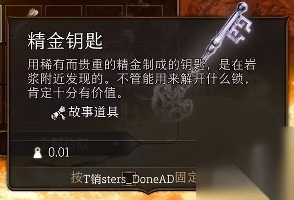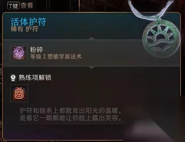 活体护符 在精金大锤旁边有个能跳过去的平台,上去之后会看到一片岩浆海还有一个巡逻的火元素,直接不理也行,一路传送到最里有个被锁住的箱子,正常撬锁难度太高了,建议直接找到钥匙打开,就在箱子后面的一个骷髅身上
