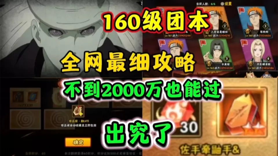 这是火影忍者手游的160级团本攻略,介绍了5个不到2000万战力的队伍,携带小奇拉比就能通关该团本,还展示了团本中寻找轮墓、战斗输出等环节的内容,小奇拉比可让技能冷却时间减少3秒。