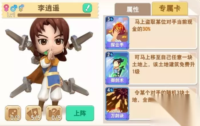 此外,游戏中“仙剑”角色们的台词也是一大看点,几位主角延续了在仙剑中的人物背景和性格设定,对白在保留人物个性和仙侠古风的基础上,加入了大富翁的元素与玩法,例如在损失金钱时,李逍遥:“婶婶会杀了我的!”,阿奴:“能不能用虫子来抵债啊~”,将角色个性表现得淋漓尽致。而此次联动最具诚意的地方还是要看游戏的道具设置了,本次联动不仅将人物的故事、外形、性格移植进入游戏,就连仙剑中的技能也没能逃过《大富翁9》的“法网”。《大富翁9》根据每位角色的技能特点,特别地将其在仙剑中的技能,定制成角色专属道具卡。如下图所示,李逍遥的“探云手”、“御剑术”、“万剑诀”技能,在《大富翁9》中变成同名的专属道具卡,既保留了仙剑特色,又对大富翁的道具卡系统进行了扩充,实在是一次有趣的创新。