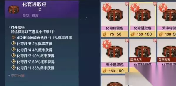 妄想山海化育进取包概率一览 4级宠物技能自选包:1% 5化育丹:2% 4化育丹:4% 3化育丹:10% 2化育丹:50% 1化育丹:33%