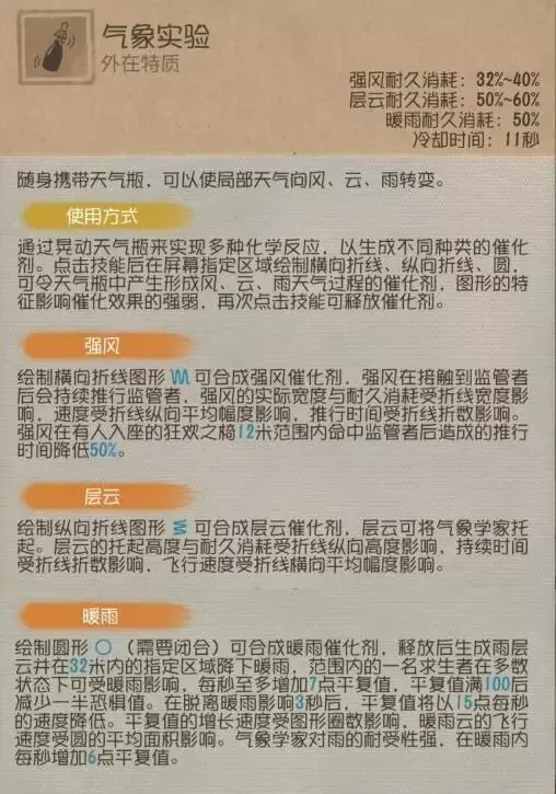 气象学家是一个技能非常全面角色,但仍然需要通过大量的实战练习,根据地形和实际情况来判断释放不同的天气催化剂来达成收益。简单来说,追击时根据身距情况使用强风推开监管者或打断监管者释放技能,在特殊地形使用层云躲避监管者技能或转点,亦可在队友被追击时使用强风来进行辅助,也可配合暖雨恢复状态。灵活利用天气瓶,从而使团队收益最大化。