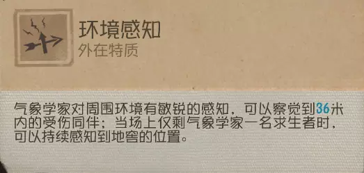 在对局中被监管者追击时,“膝跳反射”可以帮助气象学家在翻越过板窗后与监管者拉开较大身距,获得安全身距的同时也获得了更多时间来绘制折线图形以进行下一步行动。并且,当监管者身距贴近时,“肌肉记忆”和“马蝇效应”也可以帮助气象学家在板区博弈中获得优势。“宣泄效应”使受击加速时间延长0.3秒,可以帮助气象学家在受到伤害后更容易转到下一个便于牵制的区域。在受伤状态下,“防御机制”的交互加速给予气象学家更大的博弈空间,大大提高了为队友争取破译密码机或密码门的时间。