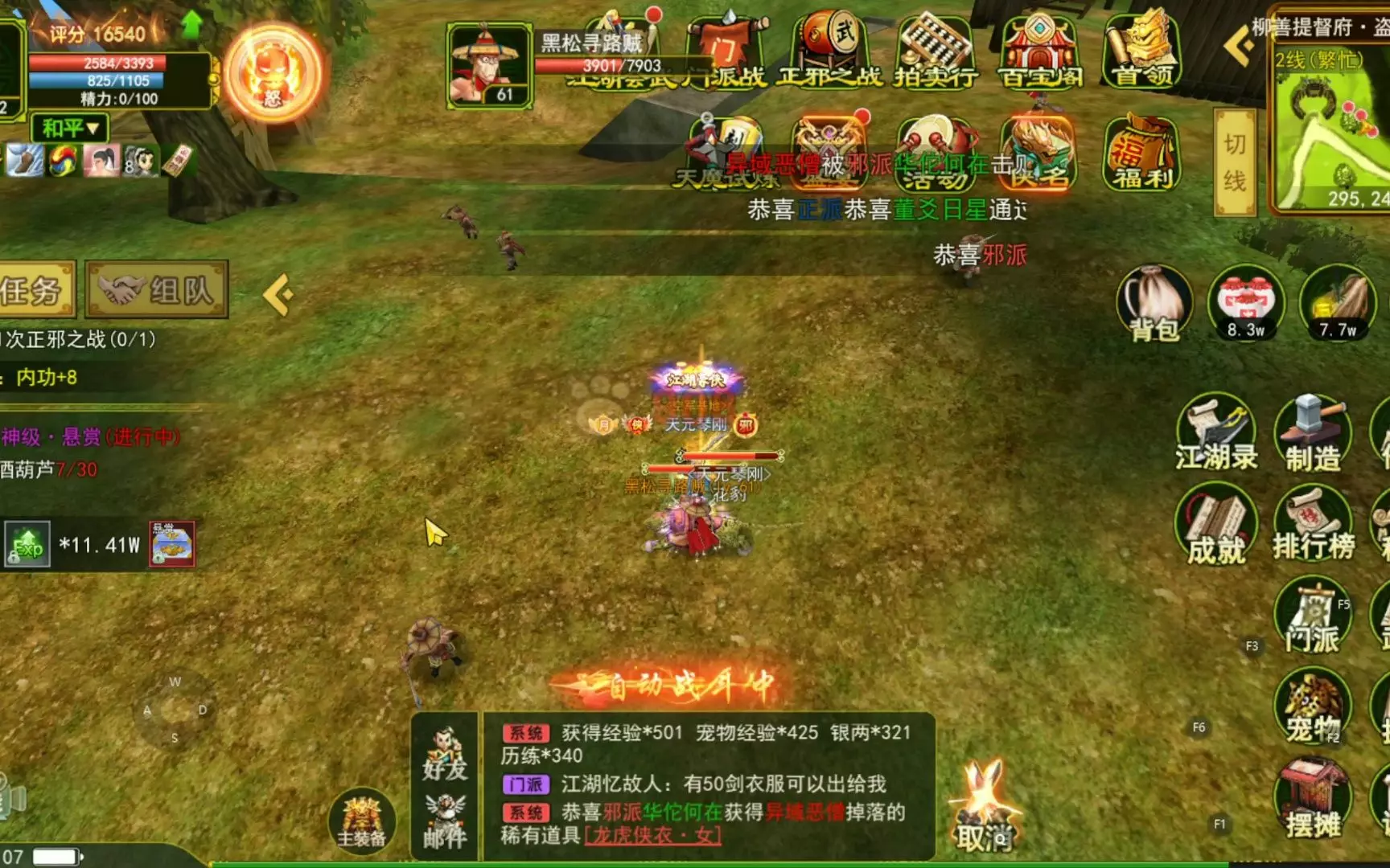 这是一期热血江湖手游的游戏解说,展示了84级角色的84技能实战效果,画面中角色组队在百武关、十塔山等地图自动战斗,完成悬赏任务,技能特效亮眼,还能获得经验、银两等奖励。