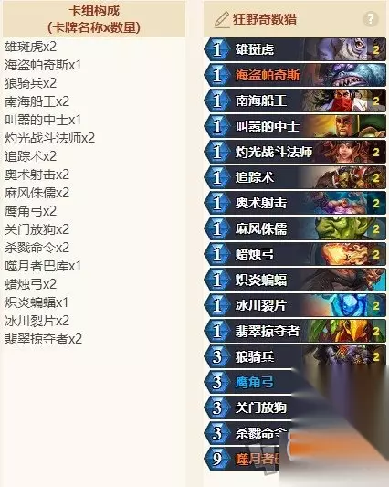 卡组思路 这套卡组和上版本的差别就是带了新卡灼光战斗法师,在尝试了很多把游戏之后放弃了支线任务病毒增援和矮人弓箭手。首先奇数猎的定位是一套抓术士和任务法的极限快攻打脸卡组,尽可能要在前期结束游戏击杀对手。 而支线任务病毒增援需要三个回合才能生效,第四回合得到收益,这个节奏就有点偏慢了,其次,矮人弓箭手虽然看上去是张怎么样都不会亏的牌,但是奇数猎需要用上他的情况少之又少。 以前接触过的奇数猎的朋友也知道奥术射击除了走脸最大的用途是解奇利亚斯,因为奇数猎的所有伤害是要尽可能走在脸上的,解场就是白给,还不如直接锤脸! 反正大家可以参考当前天梯环境来稍微调整自己卡组,祝在座的各位都能上传说~
