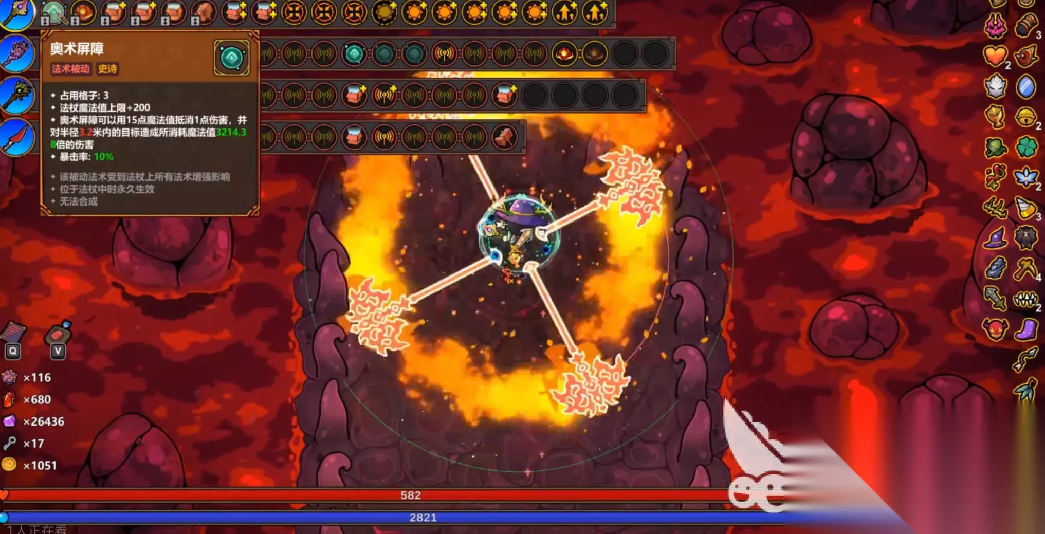此外,强化效果范围也是很有必要的。我们可以虚胖这个法术来增加体积,然后再通过范围增强的方式来扩大反伤的区域,以此来达到全屏轻松情情怀的目的。而且不管大家玩的什么流派,都需要注意魔法值的续航问题,我们可以通过法术或者是捡钥匙以及携带无尽药瓶等方法来保证魔力续航,以此来确保我们技能可以持续循环。