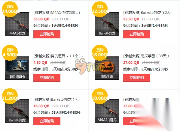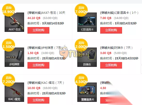 活动内容 [穿越火线]M4A1-翔龙(30天)56.00 QB(80.00 QB)剩余时间:3天8时17分36秒立即抢购直降24.00Qb [穿越火线]Barrett-翔龙(30天)52.50 QB(75.00 QB)剩余时间:3天8时17分36秒立即抢购直降 22.50Qb [穿越火线]AK47-苍龙(30天)44.10 QB(63.00 QB)剩余时间:3天8时17分36秒立即抢购直降 18.90Qb [穿越火线]幻影道具卡(1个)7.00 QB(14.00 QB)剩余时间:3天8时17分36秒立即抢购直降 7.00Qb [穿越火线]复仇道具卡(1个)4.50 QB(9.00 QB)剩余时间:3天8时17分36秒立即抢购直降 4.50Qb [穿越火线]南瓜手雷(30天)27.00 QB(45.00 QB)剩余时间:3天8时17分36秒立即抢购直降 18.00Qb