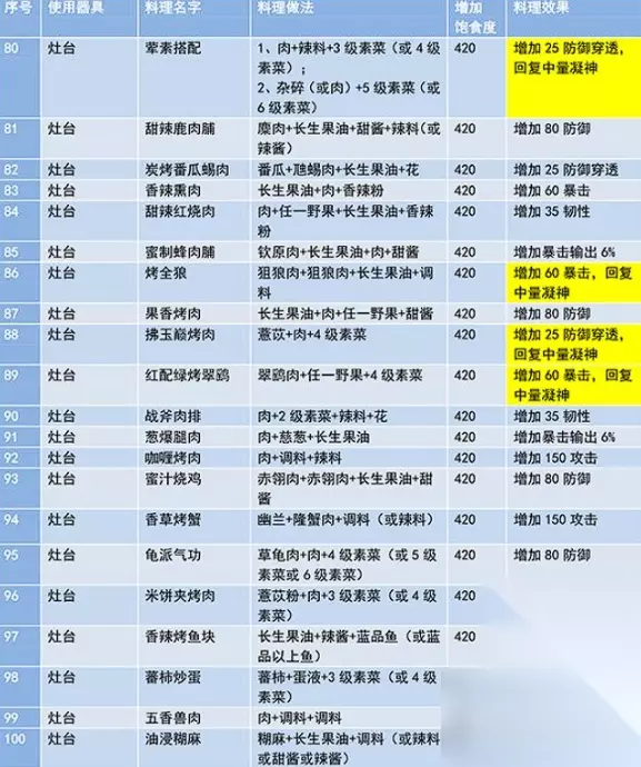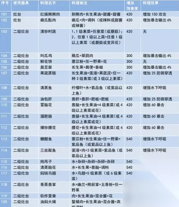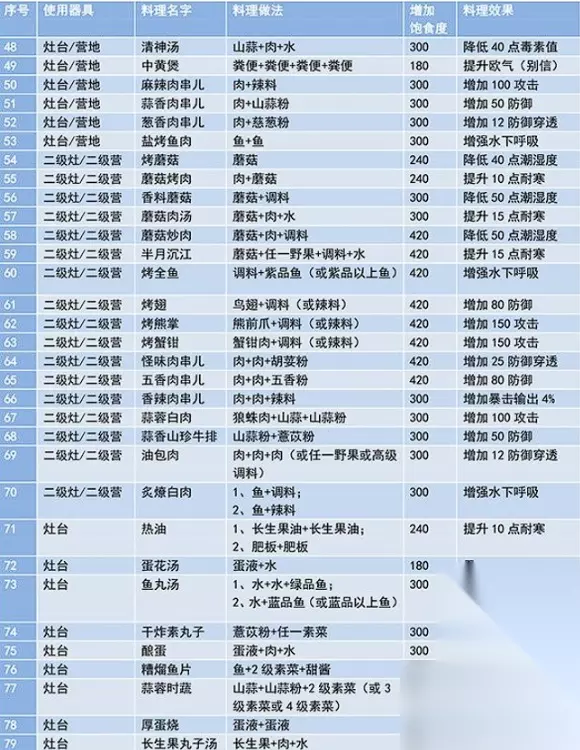 五、野营烧烤配方公式: 1、任意一种肉2个直接烤=碳烤肉串。 2、鹿肉2个=烤鹿肉。 3、小兽肉2个=小块烤肉/烤兔肉/烤蛙腿随机出。 4、任意蔬菜2个=碳烤素串。 5、水马肉2个+秦椒粉=麻辣肉串。 6、钦原肉2个+山蒜粉=蒜味肉串。 7、孟极肉2个+慈葱粉=葱味肉串。 8、骏禄肉2个+五香粉=五香肉串。 9、庞猪肉2个+香辣粉=辣味肉串。 10、彘肉2个+胡荽粉=怪味肉串。