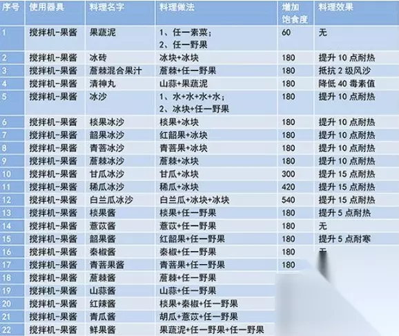 三、研磨台配方公式: 1、2个秦椒=秦椒粉。 2、 2个山蒜=山蒜粉。 3、3个薏苡=薏苡粉。 4、2个慈葱=慈葱粉。 5、2个胡荽=胡荽粉。 6、慈葱+ 山蒜+ 胡荽=五香粉。 7、2个冰块=冰沙。 8、冰块+炎果=炎果冰沙。 9、冰块+青菩=青菩冰沙。 10、冰块+薝棘=薝棘冰沙。 11、韶果+冰块=韶果冰沙。 12、甘果+2冰块=甘果冰沙。 13、西瓜+2冰块=西瓜冰沙。 14、慈葱+山蒜+秦椒=香辣粉。