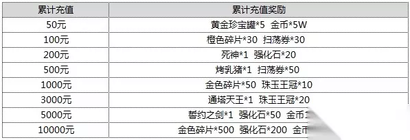 活动二、累计充值 好礼不停 【活动时间】5月1日00:00-5月3日24:00 【活动内容】活动期间内,玩家累计充值到达一定金额时,就会获得相应的奖励,活动结束后3个工作日内(5月7日前)进行统计发放。 注:奖励可叠加,例如充值最高档的金额可获得所有奖励。